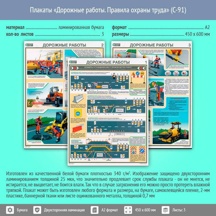 Плакаты «Дорожные работы. Правила охраны труда» (С-91, ламинированная бумага, А2, 3 листа) в Уфе купить