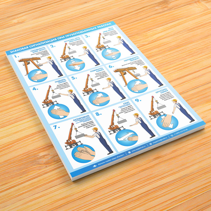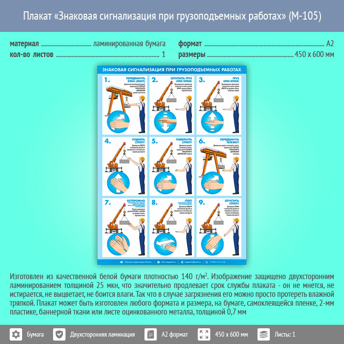 Плакат «Знаковая сигнализация при грузоподъемных работах» (М-105, ламинированная бумага, А2, 1 лист) в Уфе купить