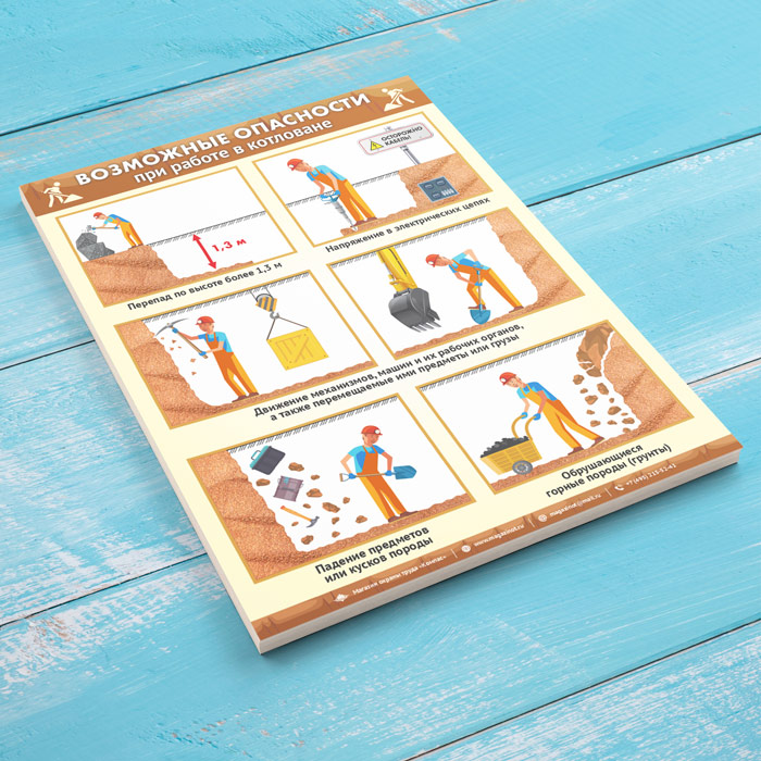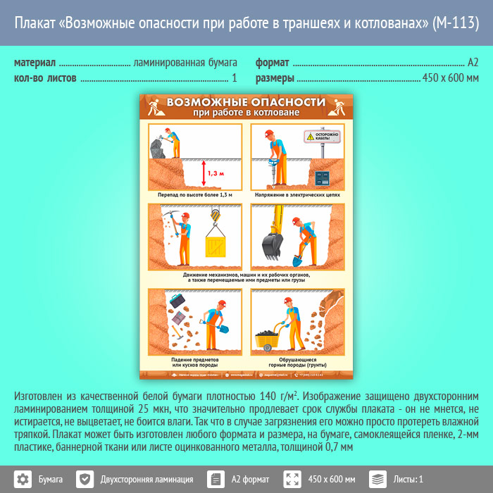 Плакат «Возможные опасности при работе в траншеях и котлованах» (М-113, ламинированная бумага, А2, 1 лист) в Уфе купить