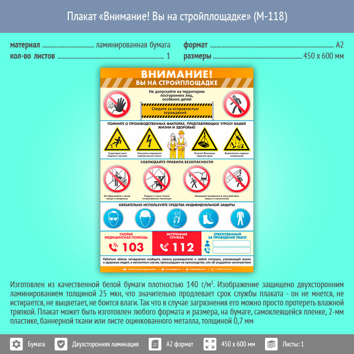 Плакат «Внимание! Вы на стройплощадке» (М-118, ламинированная бумага, А2, 1 лист) в Уфе купить