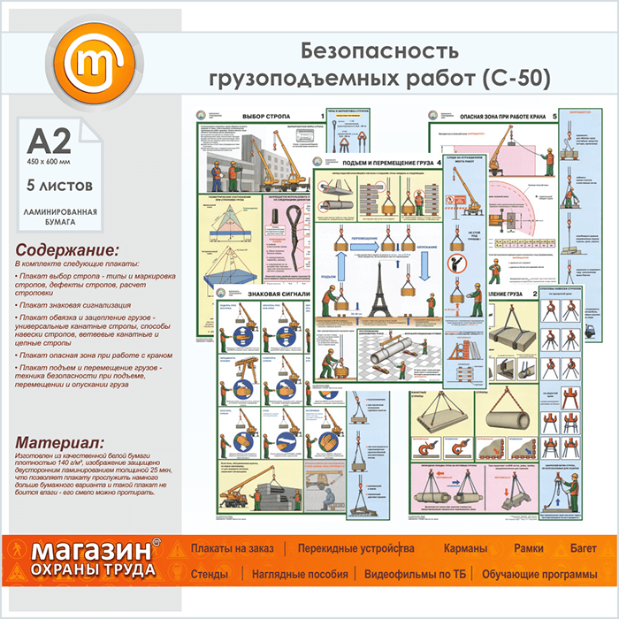 Плакаты «Безопасность грузоподъемных работ» (С-50, ламинированная бумага, А2, 5 листов) в Уфе купить
