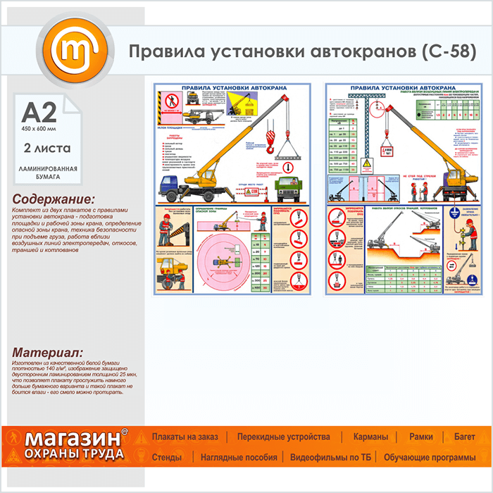 Плакаты «Правила установки автокранов» (С-58, ламинированная бумага, А2, 2 листа) в Уфе купить