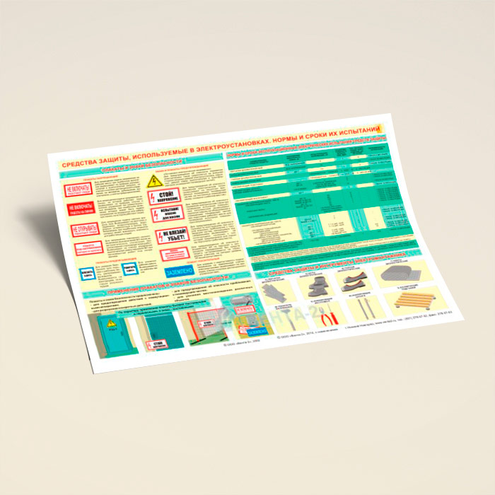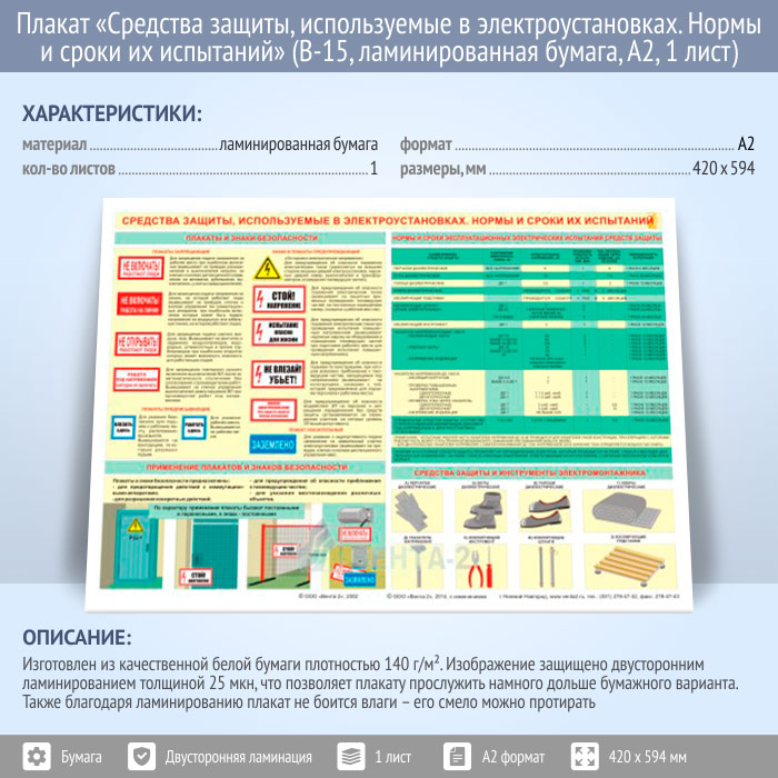 Плакат «Средства защиты, используемые в электроустановках. Нормы и сроки их испытаний» (В-15, ламинированная бумага, А2, 1 лист) в Уфе купить