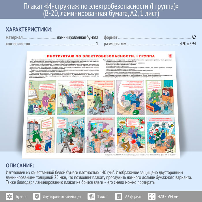 Плакат «Инструктаж по электробезопасности (I группа)» (В-20, ламинированная бумага, А2, 1 лист) в Уфе купить