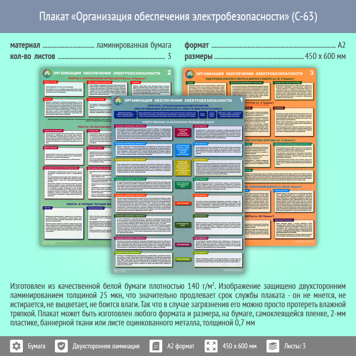 Плакаты «Организация обеспечения электробезопасности» (С-63, ламинированная бумага, А2, 3 листа) в Уфе купить