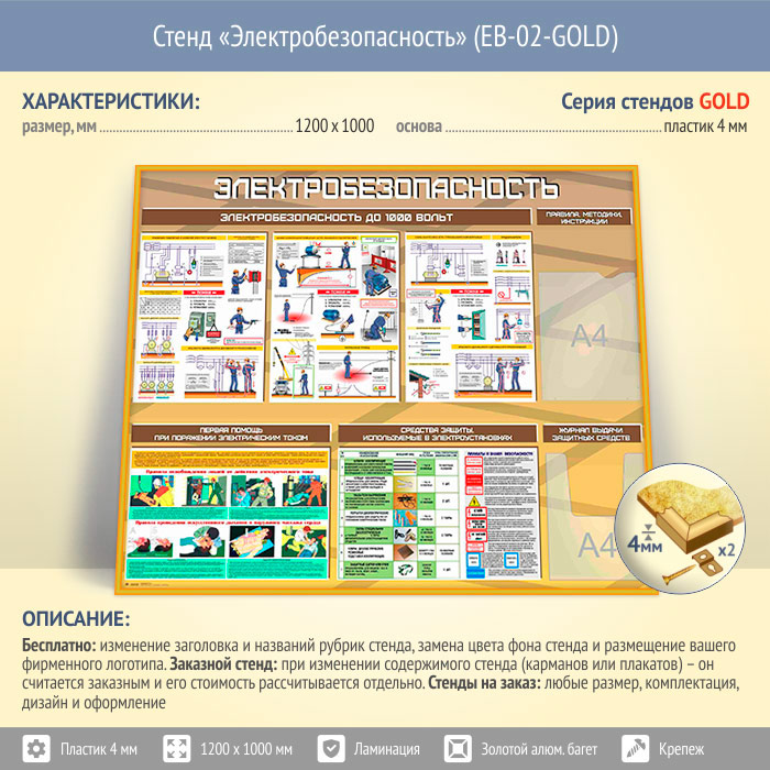 Стенд «Электробезопасность до 1000 вольт» с плоским и объемным карманами (EB-02-GOLD) в Уфе купить