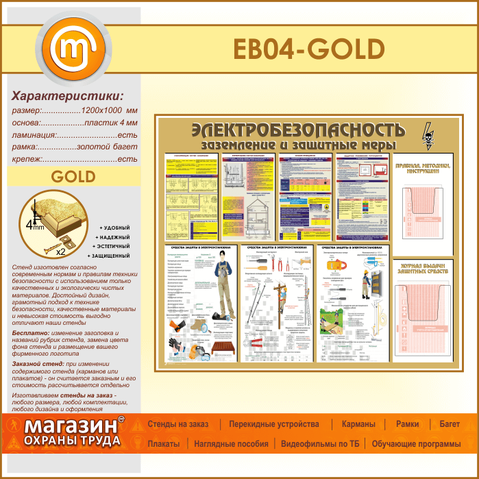 Стенд «Электробезопасность. Заземление и защитные меры» с 2 объемными карманами (EB-04-GOLD) в Уфе купить