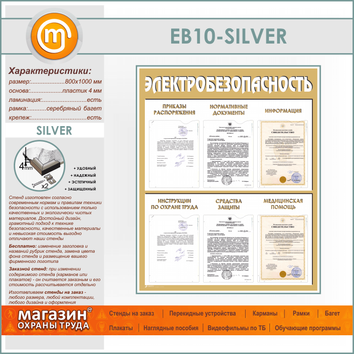Стенд «Электробезопасность» с 6 карманами (EB-10-SILVER) в Уфе купить