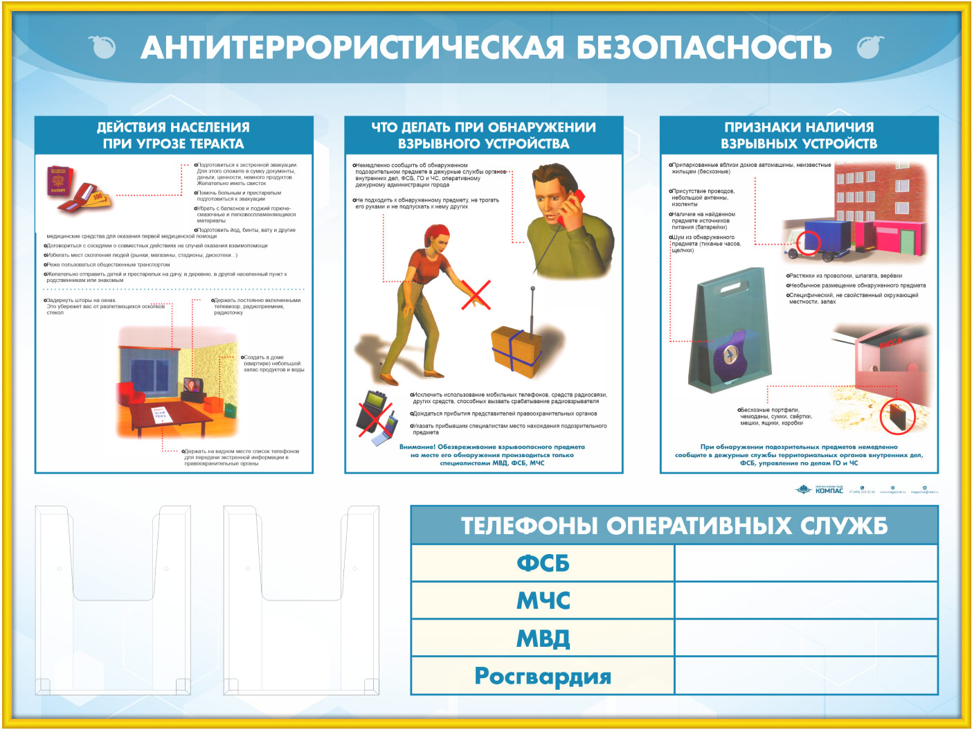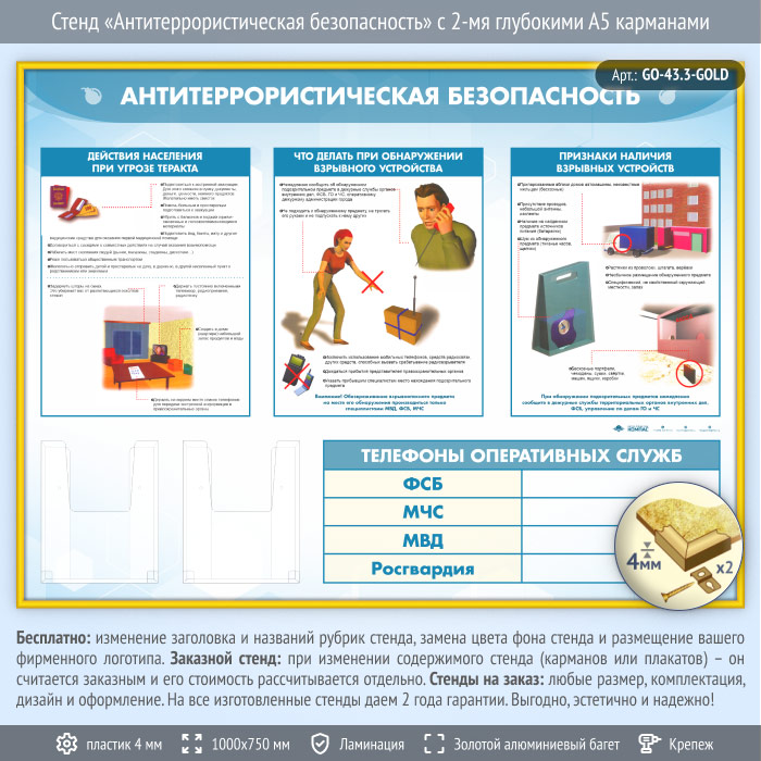 Стенд «Антитеррористическая безопасность» с 2-мя глубокими А5 карманами (GO-43.3-GOLD) в Уфе купить