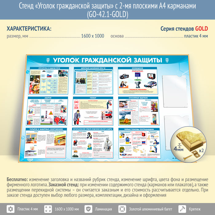 Стенд «Уголок гражданской защиты» с 2-мя плоскими А4 карманами (GO-42.1-GOLD) в Уфе купить