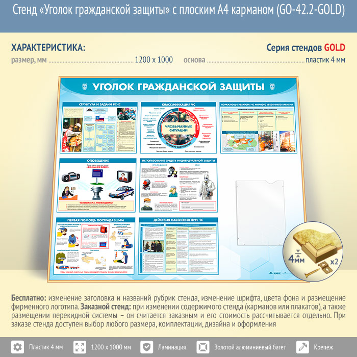 Стенд «Уголок гражданской защиты» с плоским А4 карманом (GO-42.2-GOLD) в Уфе купить