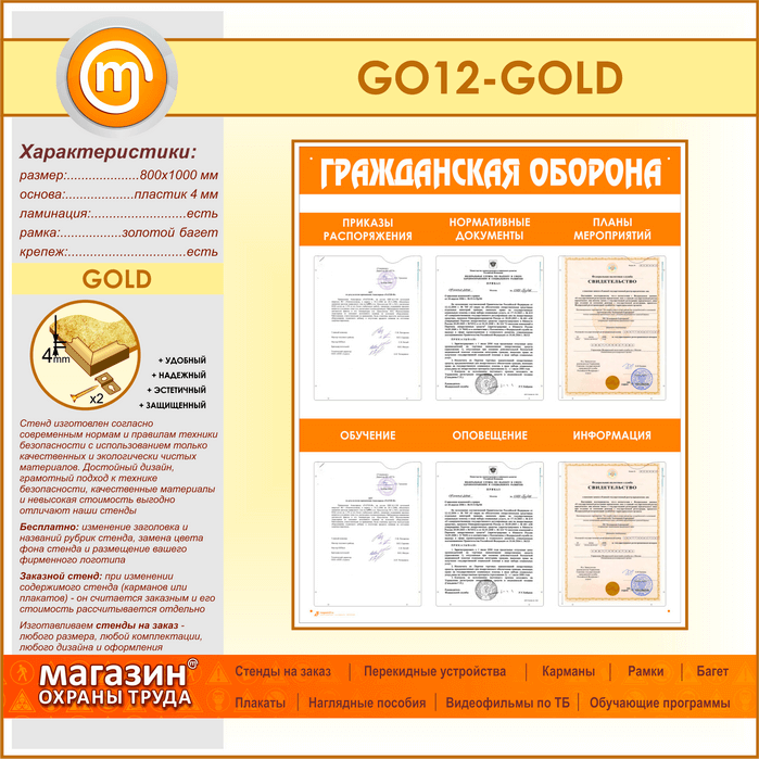 Стенд «Гражданская оборона» с 6 плоскими карманами (GO-12-GOLD) в Уфе купить
