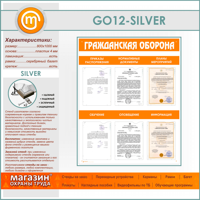 Стенд «Гражданская оборона» с 6 плоскими карманами (GO-12-SILVER) в Уфе купить