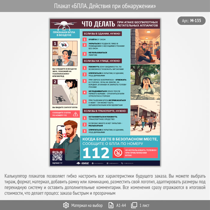 Плакат «БПЛА. Действия при обнаружении» с QR (М-135, 1 лист) в Уфе купить