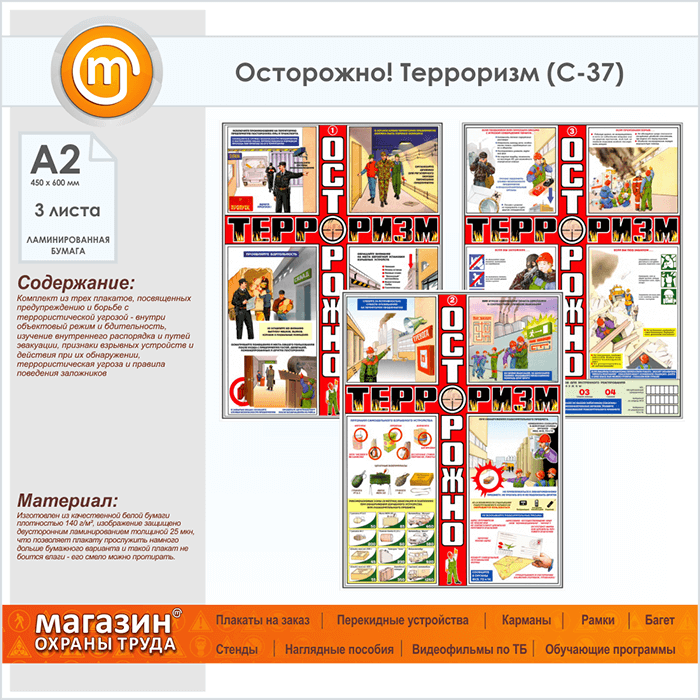 Плакаты «Осторожно! Терроризм» (С-37, ламинированная бумага, А2, 3 листа) в Уфе купить