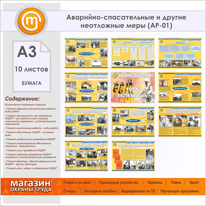 Плакаты «Аварийно-спасательные и другие неотложные меры» (АР-01, бумага, А3, 10 листов) в Уфе купить