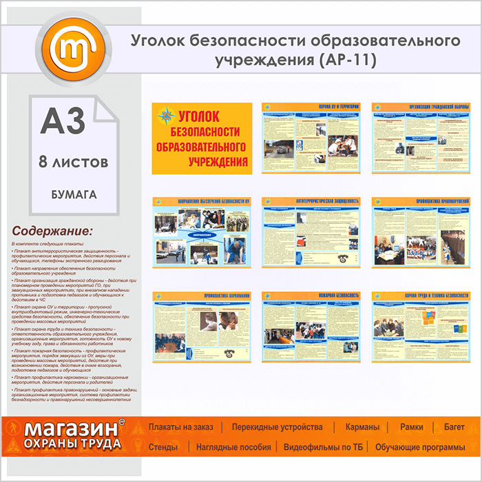 Плакаты «Уголок безопасности образовательного учреждения» (АР-11, бумага, А3, 8 листов) в Уфе купить