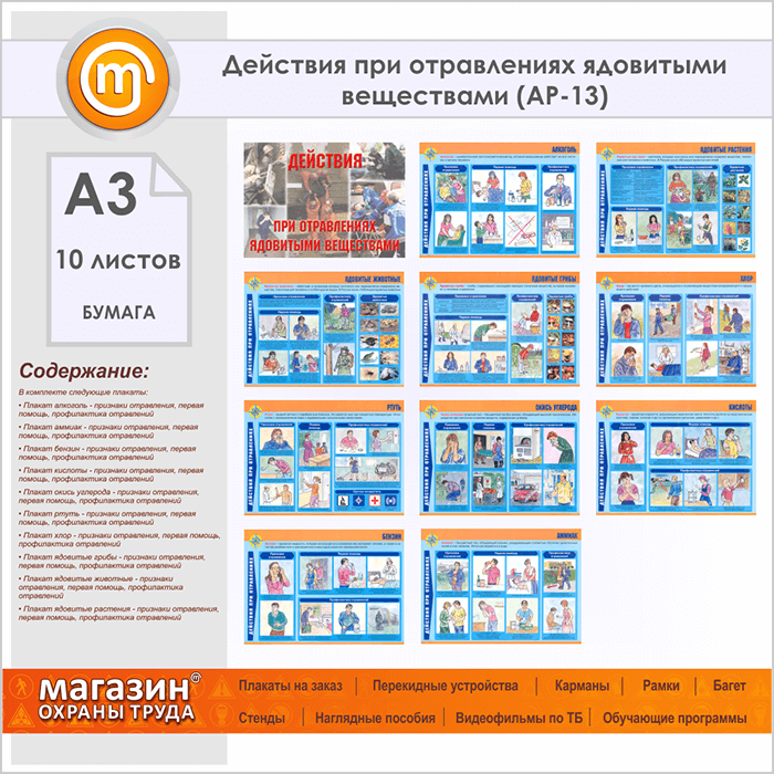 Плакаты «Действия при отравлениях ядовитыми веществами» (АР-13, бумага, А3, 10 листов) в Уфе купить