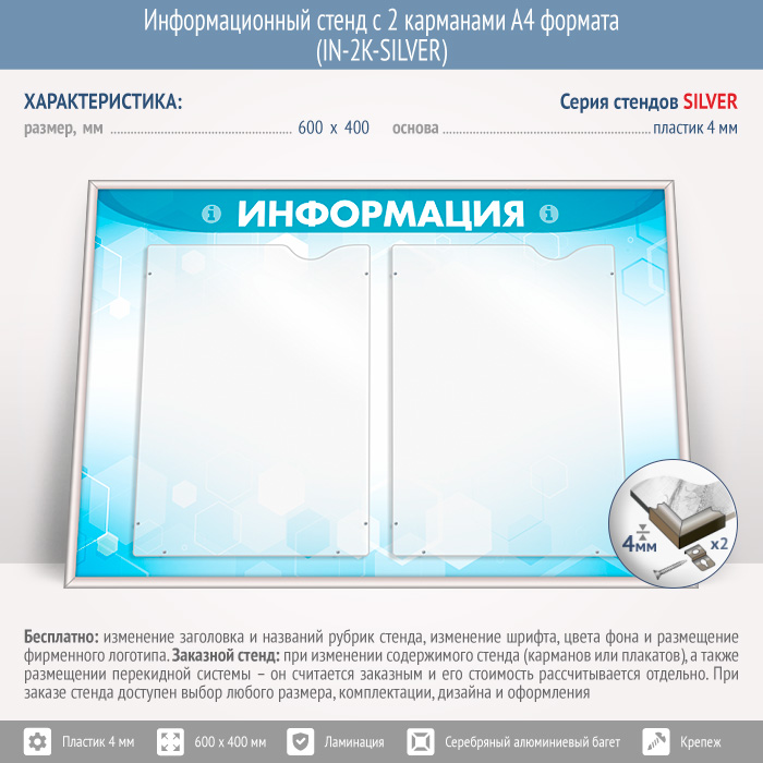 Информационный стенд с 2 карманами А4 формата (IN-2K-SILVER) в Уфе купить