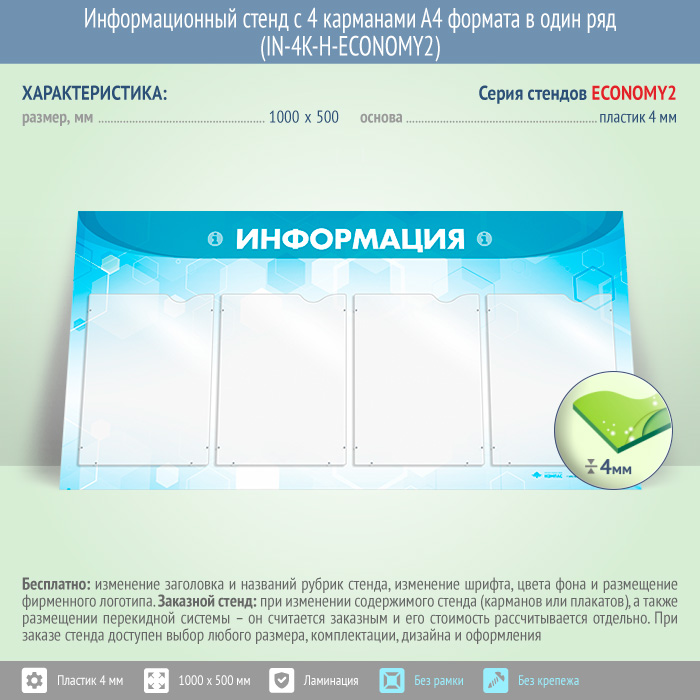 Информационный стенд с 4 карманами А4 формата в один ряд (IN-4K-H-ECONOMY2) в Уфе купить