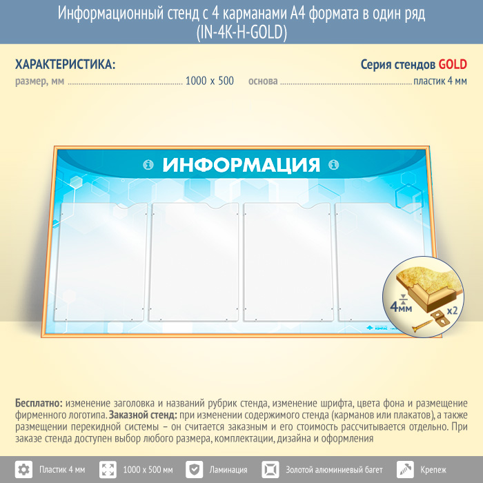 Информационный стенд с 4 карманами А4 формата в один ряд (IN-4K-H-GOLD) в Уфе купить