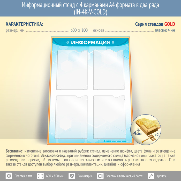 Информационный стенд с 4 карманами А4 формата в два ряда (IN-4K-V-GOLD) в Уфе купить