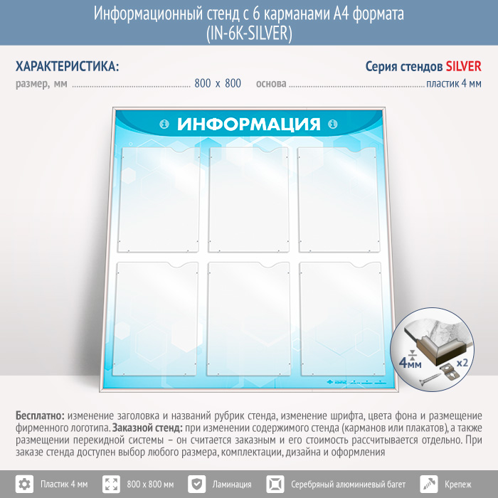 Информационный стенд с 6 карманами А4 формата (IN-6K-SILVER) в Уфе купить
