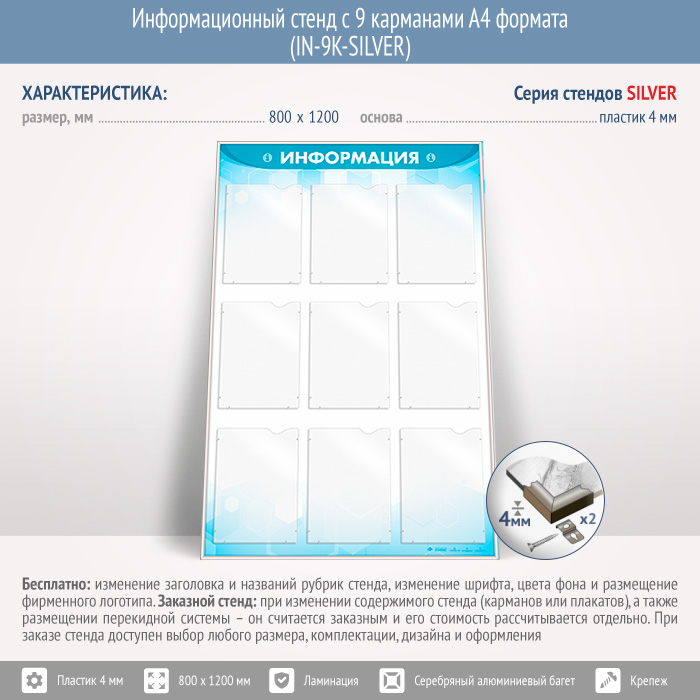Информационный стенд с 9 карманами А4 формата (IN-9K-SILVER) в Уфе купить