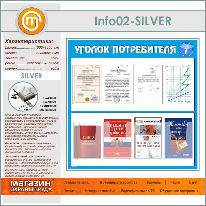Стенд «Уголок потребителя» с 4 плоскими и 4 объемными карманами А4 формата (IN-02-SILVER) в Уфе купить