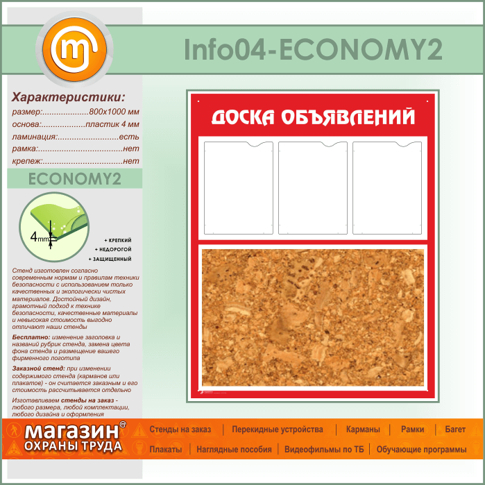 Стенд «Доска объявлений» с пробковым полотном и 3 карманами А4 формата (IN-04-ECONOMY2) в Уфе купить