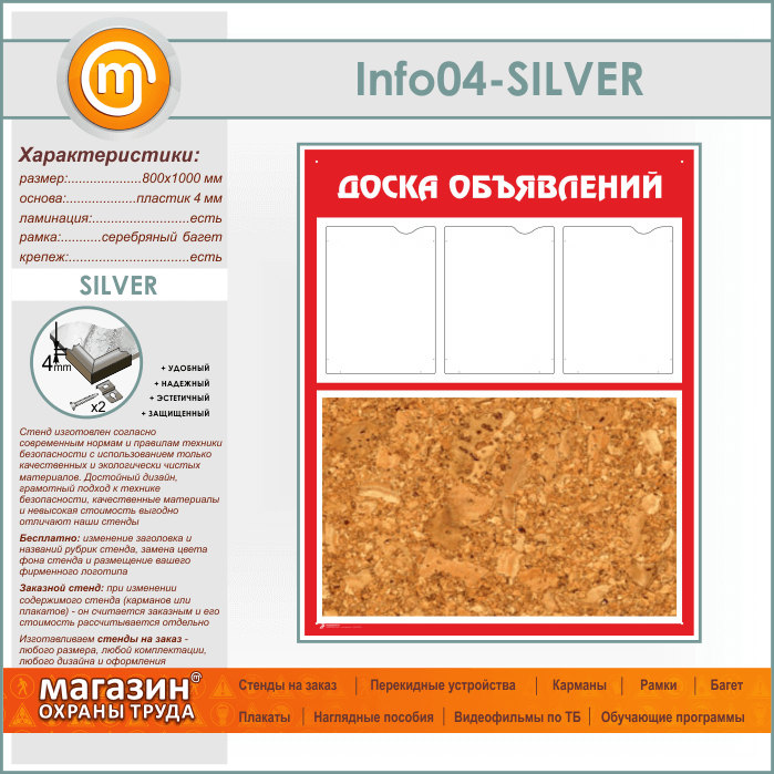 Стенд «Доска объявлений» с пробковым полотном и 3 карманами А4 формата (IN-04-SILVER) в Уфе купить