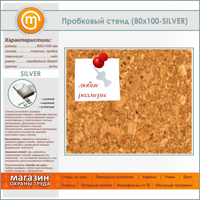 Пробковая доска, 100х80 см (IN-05-SILVER) в Уфе купить