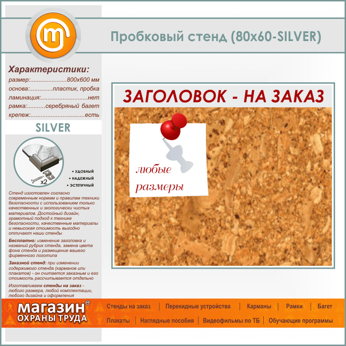 Пробковая доска с заголовком, 80х60 см (IN-06-SILVER) в Уфе купить