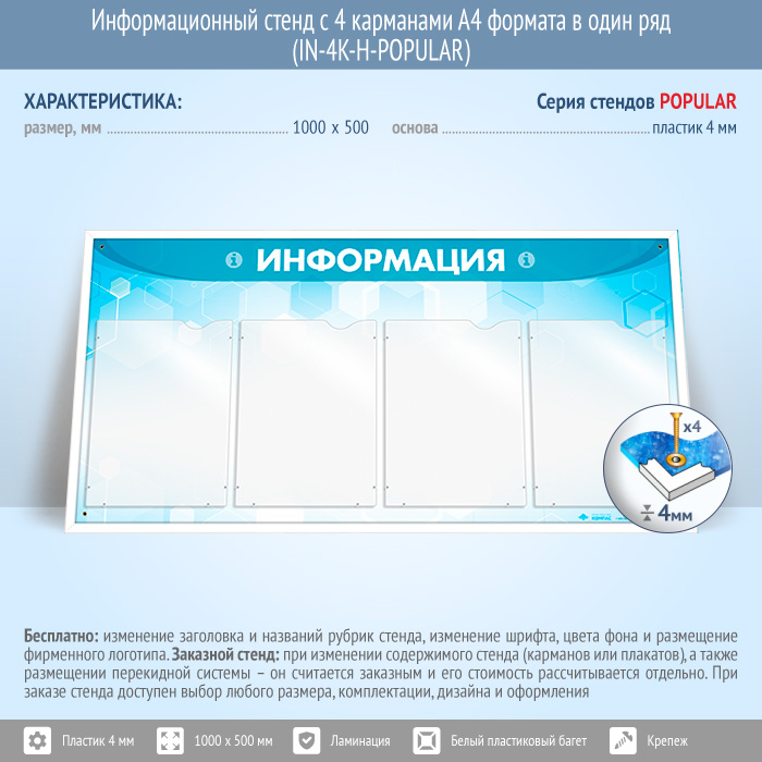 Информационный стенд с 4 карманами А4 формата в один ряд (IN-4K-H)