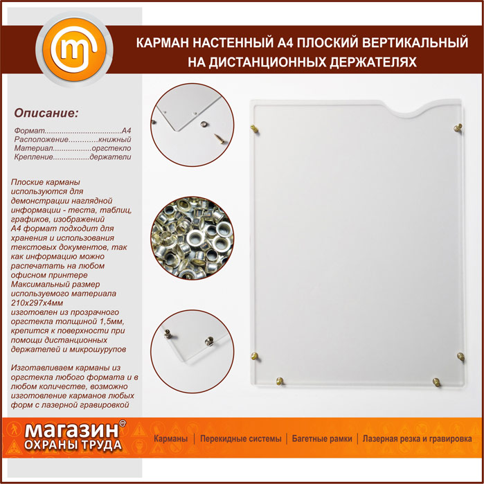 Карман настенный А4 плоский вертикальный на дистанционных держателях в Уфе купить