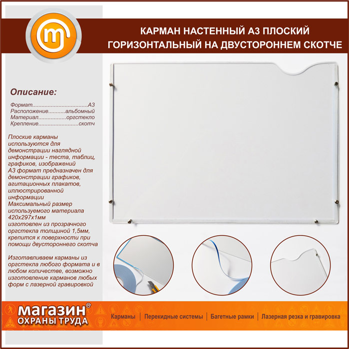 Карман настенный А3 плоский горизонтальный на двустороннем скотче в Уфе купить