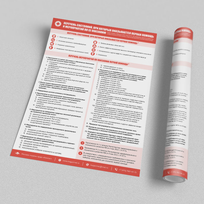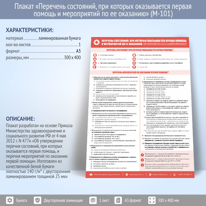 Плакат «Перечень состояний, при которых оказывается первая помощь и мероприятий по ее оказанию» (на основе Приказа от 04.05.2012 N 477н) (М-101, ламинированная бумага, А3, 1 лист) в Уфе купить