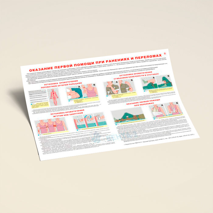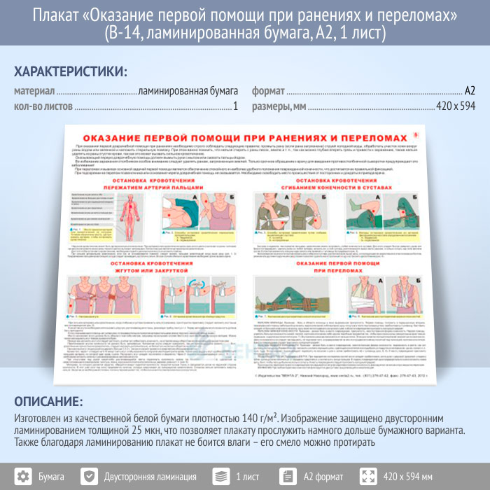 Плакат «Оказание первой помощи при ранениях и переломах» (В-14, ламинированная бумага, А2, 1 лист) в Уфе купить