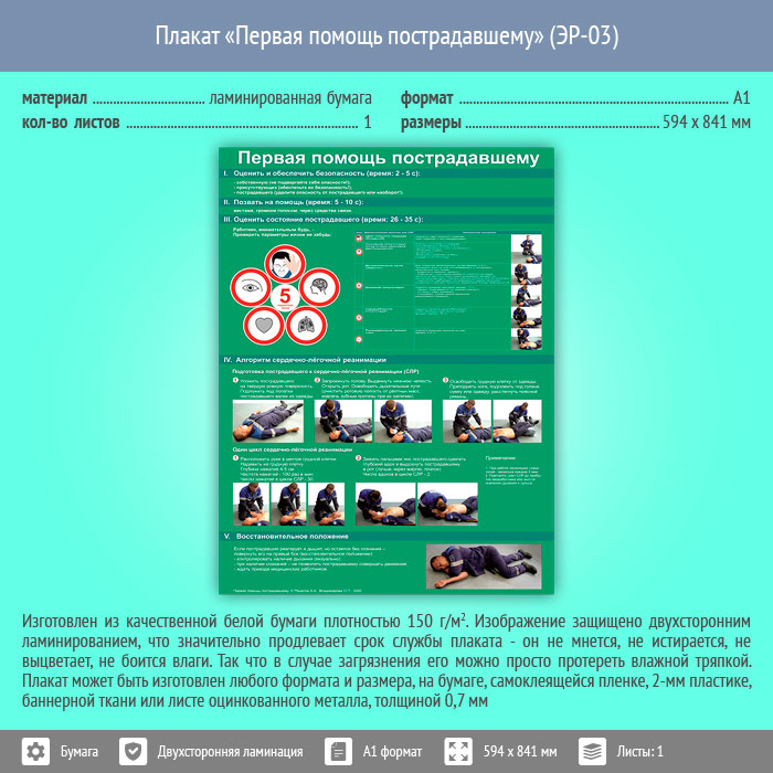 Плакат «Первая помощь пострадавшему» (ЭР-03, ламинированная бумага, А1, 1 лист) в Уфе купить
