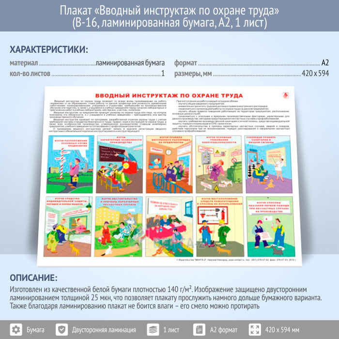 Плакат «Вводный инструктаж по охране труда» (В-16, ламинированная бумага, А2, 1 лист) в Уфе купить