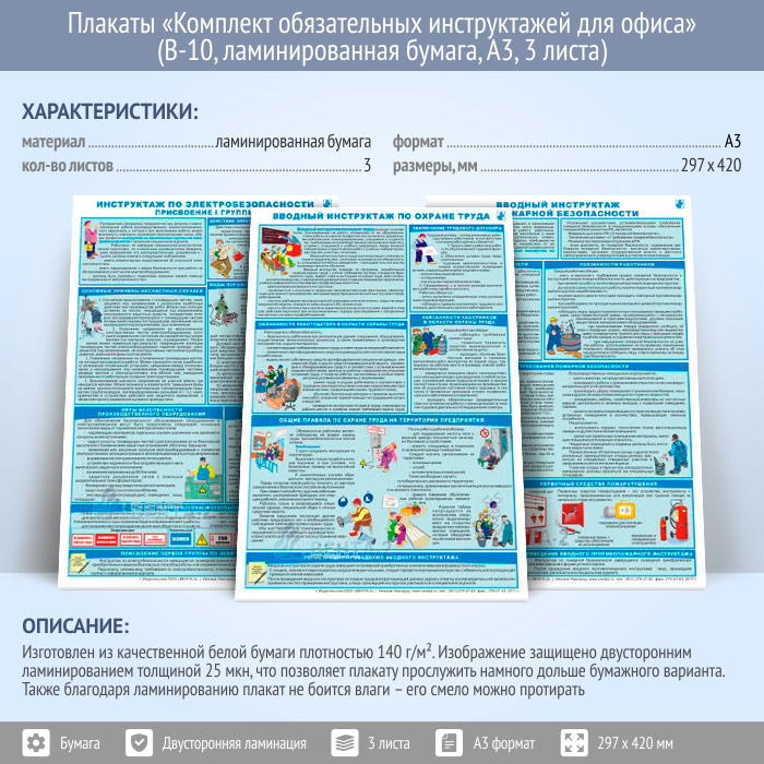 Плакаты «Комплект обязательных инструктажей для офиса» (В-10, ламинированная бумага, А3, 3 листа) в Уфе купить