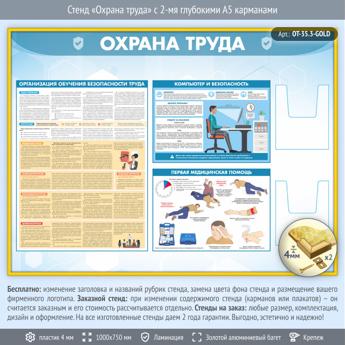 Стенд «Охрана труда» с 2-мя глубокими А5 карманами (OT-35.3-GOLD) в Уфе купить