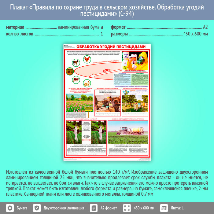 Плакат «Правила по охране труда в сельском хозяйстве. Обработка угодий пестицидами» (С-94, ламинированная бумага, А2, 1 лист) в Уфе купить