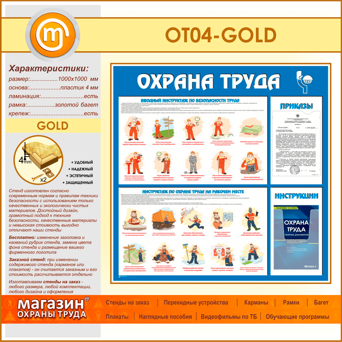 Стенд «Охрана труда» с плоским и объемным карманами (OT-04-GOLD) в Уфе купить