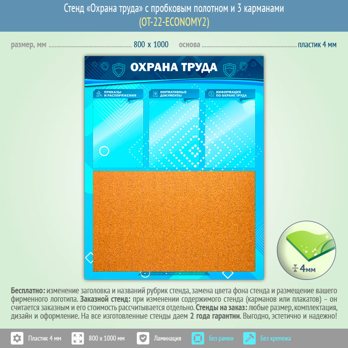 Стенд «Охрана труда» с пробковым полотном и 3 карманами (OT-22-ECONOMY2) в Уфе купить