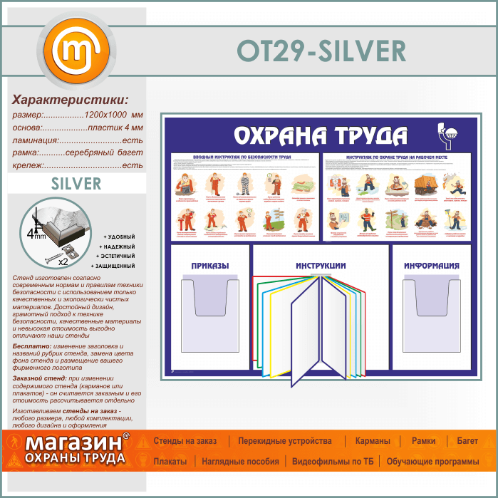 Стенд «Охрана труда» с перекидной системой и 2 объемными карманами (OT-29-SILVER) в Уфе купить