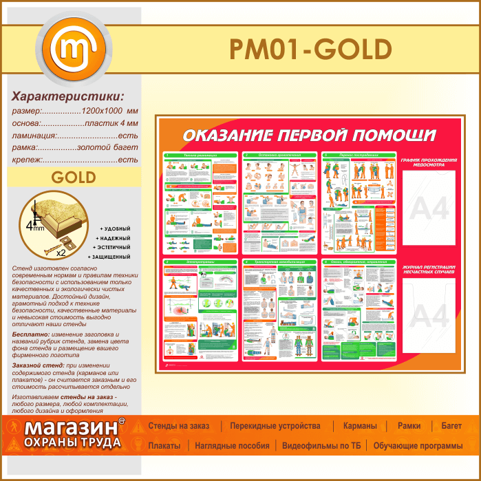 Стенд «Оказание первой помощи» с плоским и объемным карманами (PM-01-GOLD) в Уфе купить
