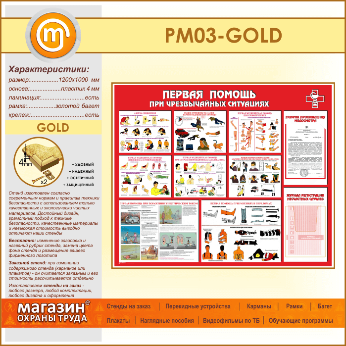 Стенд «Первая помощь при чрезвычайных ситуациях» с плоским и объемным карманами (PM-03-GOLD) в Уфе купить