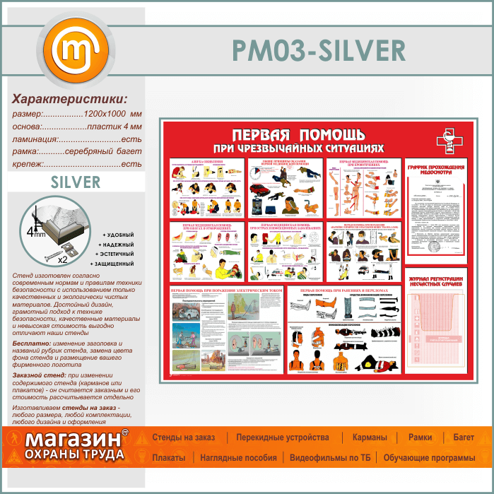 Стенд «Первая помощь при чрезвычайных ситуациях» с плоским и объемным карманами (PM-03-SILVER) в Уфе купить