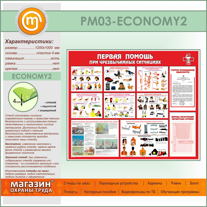 Стенд «Первая помощь при чрезвычайных ситуациях» с плоским и объемным карманами (PM-03-ECONOMY2) в Уфе купить